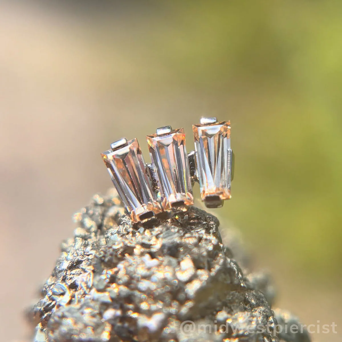 Our Baguette Fan End showcases a stunning trio of 4mm baguette-cut gems, arranged in a gentle curve. Measuring 6mm wide, this elegant piece is designed to catch the light from every angle.