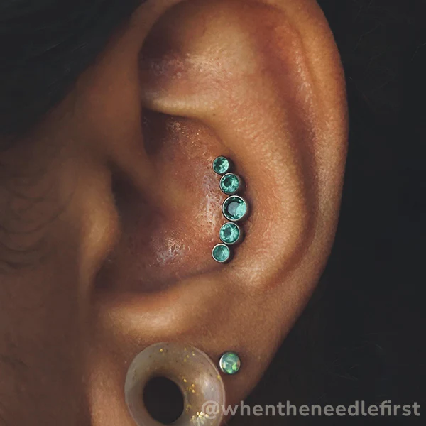 This dazzling array of gems is the perfect threadless end for a variety of ear piercings. Each curved gem cluster is made from implant-certified titanium and is available with either 3 or 5 sparkling bezel-set gems.